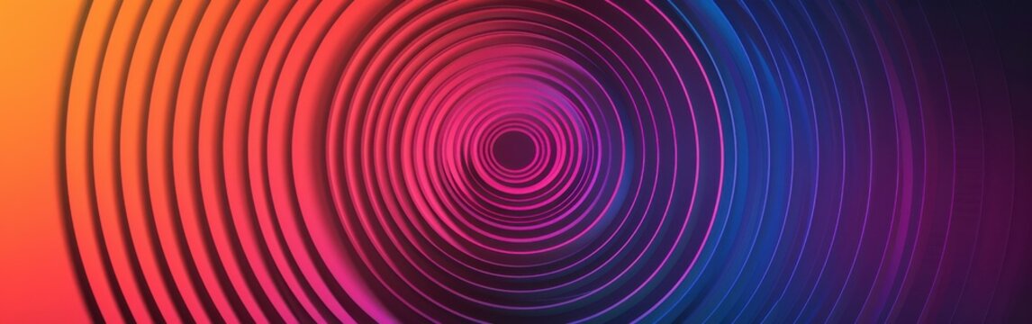 A digital abstract image features a series of concentric circles that radiate outwards in a swirling, hypnotic pattern. The circles are rendered in a colorful gradient of orange, pink, purple, and blu