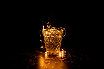 Guirlande lumineuse scintillante dans un verre transparent avec reflets dorés, verre vue de face centré dans l'image et posé sur un fond brun foncé avec étoiles dorées brillantes parsemées autour