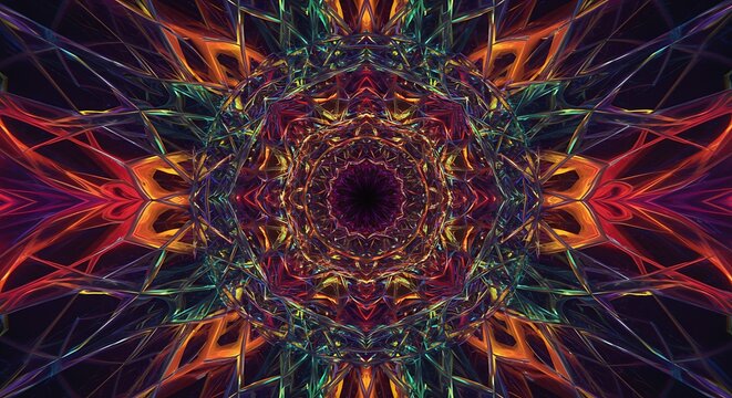 Vibrant kaleidoscope mandala with glowing, symmetrical patterns