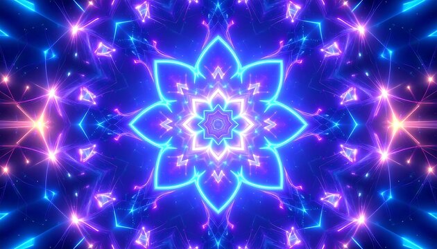 A vibrant, symmetrical kaleidoscope pattern with glowing pink neon lines over a textured blue background.