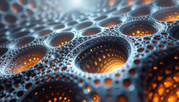 Abstract iridescent background design, 3d render, showcasing an intricate, fractal pattern. The iridescent surfaces shimmer with a rainbow of colors, creating a hypnotic and complex visual effect.