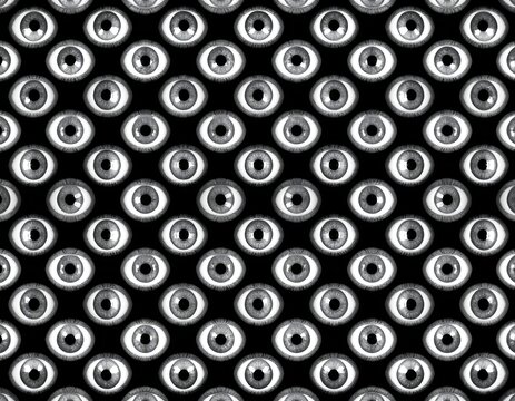 Repeating pattern of grayscale eyes on black background, creating a hypnotic effect