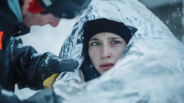 Compassionate Response: First Aider Shields Hypothermic Patient with Blanket in Life-Saving Gesture