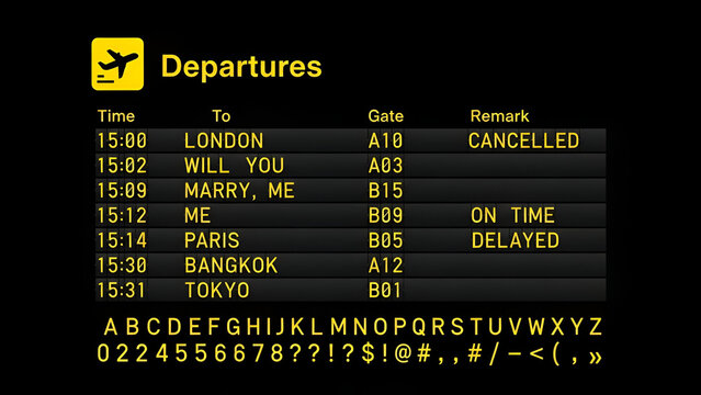 Humorous airport departures board showing flights to unexpected destinations and marriage proposal