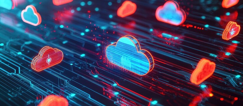 Abstract cloud computing concept with digital cloud shape. Modern tech, data management, storage, and secure server services. Innovation, transformation, and digital tech solutions.