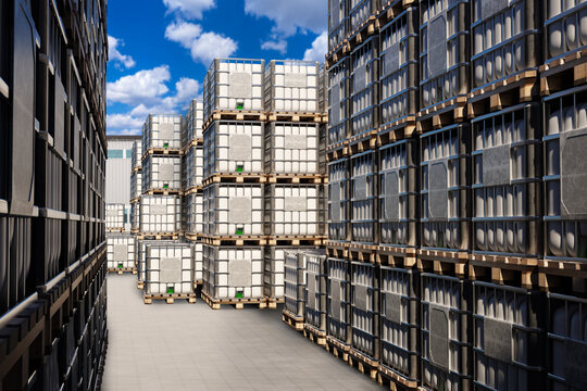 Street warehouse for liquid products. IBC containers in industrial area. Plastic square barrels on pallets. Warehouse area with IBC containers. Industrial tanks for liquid in metal sheathing. 3d image