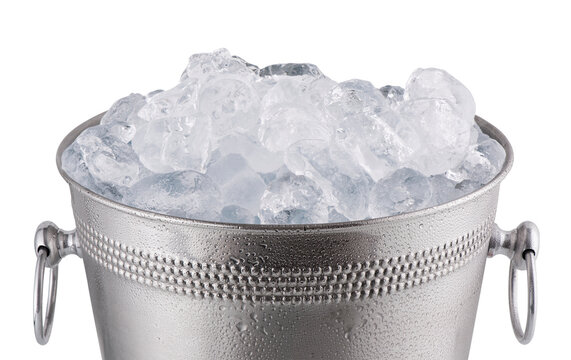 silver bucket filled with ice cubes, glistening under soft light, creates refreshing and cool atmosphere. Perfect for summer gatherings or parties