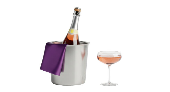 Isolated Rose wine bottle in ice bucket, with glass of rose wine on table, no background
