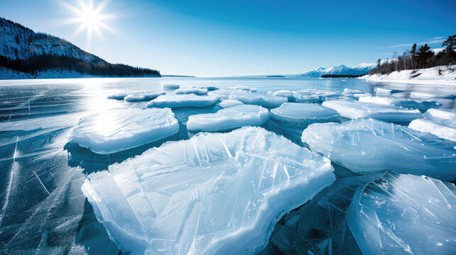 The photo shows a frozen lake with large chunks of ice floating on the surface. The sun is shining brightly, and the sky is clear.