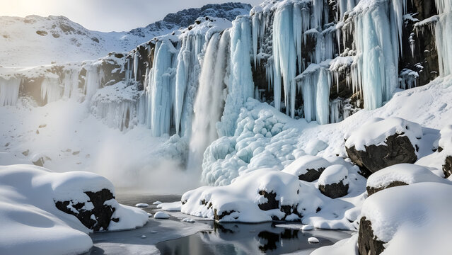 Frozen waterfall amid snowy cliffs and icy pool
