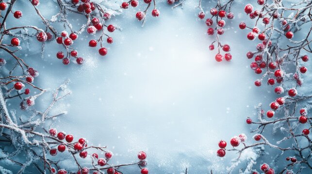 Snow-covered board frame framed by branches with red berries covered in frost. Copy space.