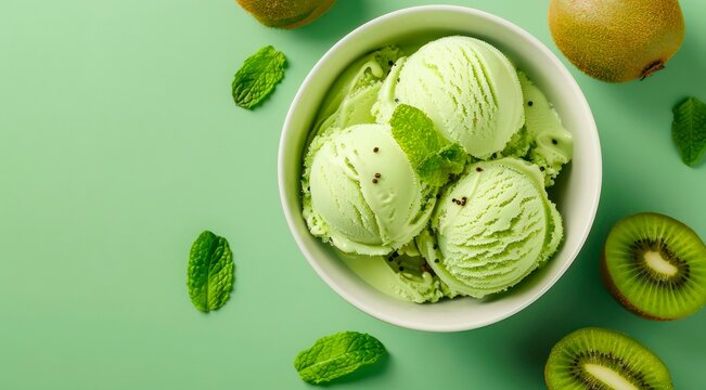 Bowl of kiwi ice cream scoops and fresh fruits on pastel green background, top view.