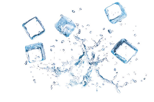 Ice Cubes explosion flying, crystal clear ice wave floating, fall down in air. Ice Brick block cube is frozen water healthy thirsty. White background Isolated high speed shutter, freeze stop motion
