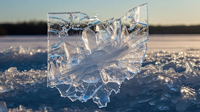 Floating rectangular ice block showing cracked veins and prism glints, translucent crystal slab