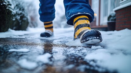 Worker in winter boots melts ice, snow on slippery sidewalk using de-icing liquid. Person walks on pathway to prevent accident. Outdoor maintenance in cold weather. Home property care. Safety on icy