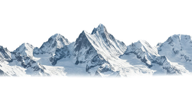 majestic, snow-covered alpine mountain peaks with glacial blue ice, shot with wide-angle perspective and dramatic rim lighting on an infinite white background with ample copy space. concept for