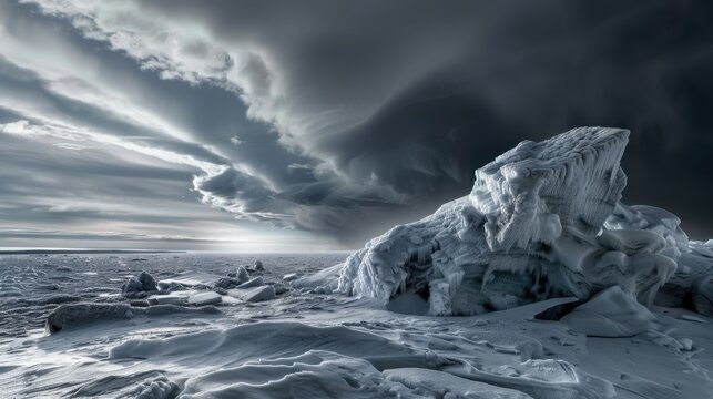 A dramatic view of a high-altitude ice shelf with intricate, fractal ice formations and a rare, intense polar storm brewing on the horizon