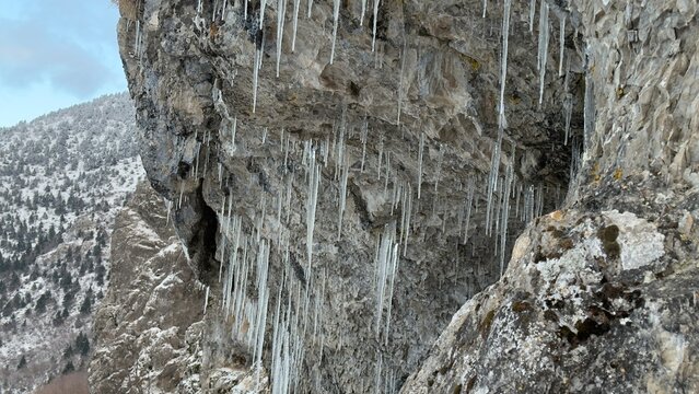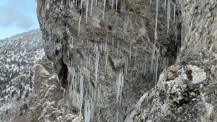 Cold winter weather in the mountains with snow in the Alps. Mountain landscape with ice stalactites hanging from a roof.