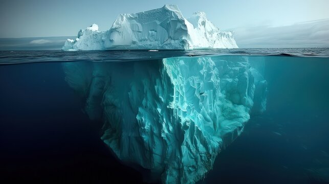 3D iceberg floating in the ocean, its tip above water and a massive submerged structure below. The metaphorical visual suggests hidden success.