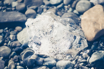 Closeup of the crystal clear little icebergs floating on the water in Iceland
