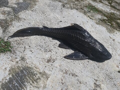 Large Black Armored Pleco Catfish Lying on Concrete Ground