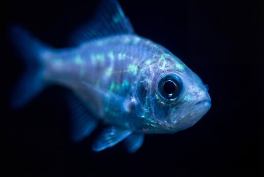 Close up view of translucent blue glass fish swimming in dark black water