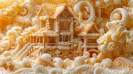 A 3D cake with intricate icing designs on a soft background, symbolizing celebration and craftsmanship