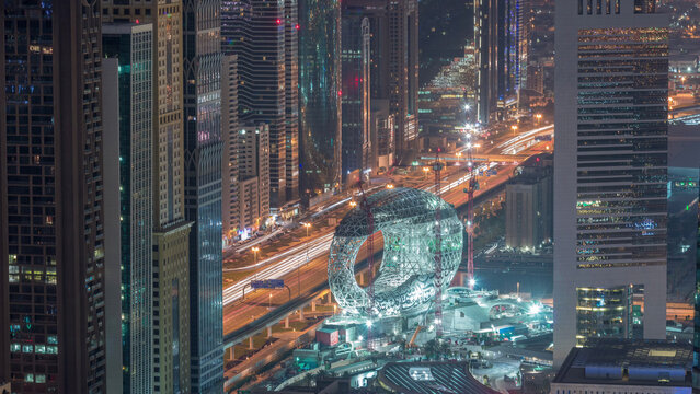 Construction site of the Museum of the Future aerial night to day timelapse, next iconic building of Dubai.
