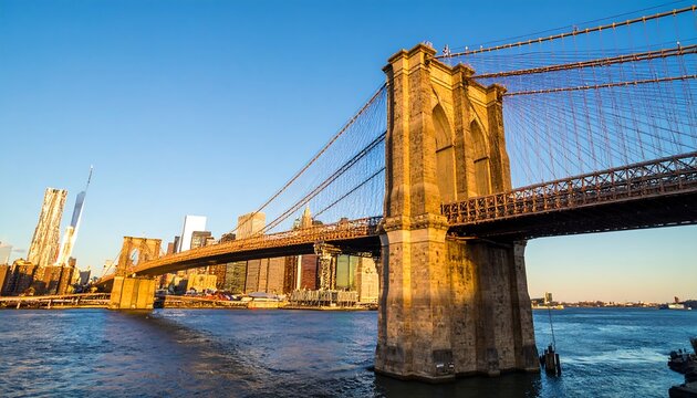 Unique perspective of brooklyn bridge cables and tower against blue sky