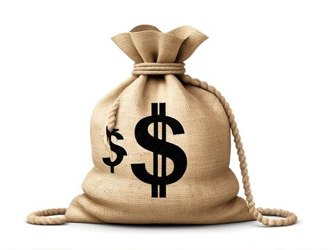 Simple yet iconic burlap money pouch with a dollar sign, clean white backdrop.