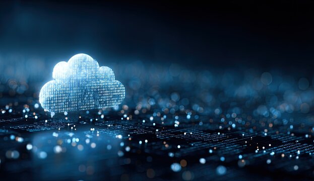 Glowing digital cloud icon hovers over a circuit board, representing cloud computing and data storage.