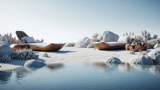 Winter beach at sunset, icy shoreline, snowy seashells, distant mountains, orange-pink sky.