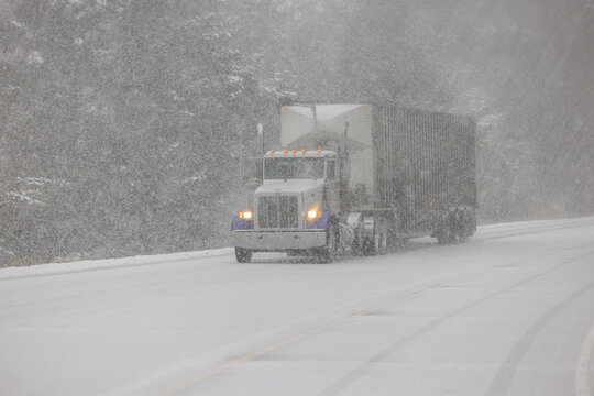 Snow-dusted luxury car led headlight glowing on icy forest road at dusk and falling snow