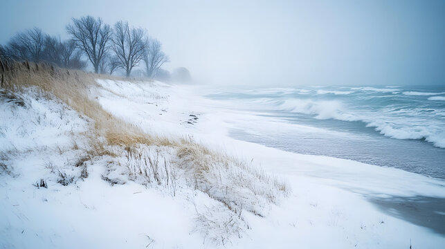 Mist-shrouded frosted marsh with icy pools and falling snowflakes, tranquil winter wetland