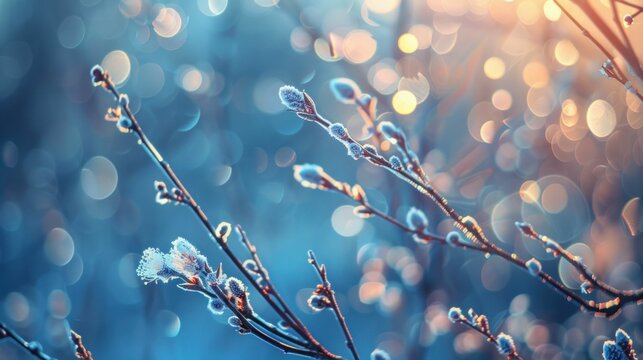 Winter branches with delicate frost-covered buds on a vibrant blue bokeh background. Ideal for seasonal and nature-themed designs.