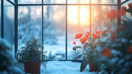 Delicate white blooms of a fruit tree contrast with icy snow cover, seasonal, frost