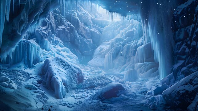 Inside an icy cave with blue translucent walls