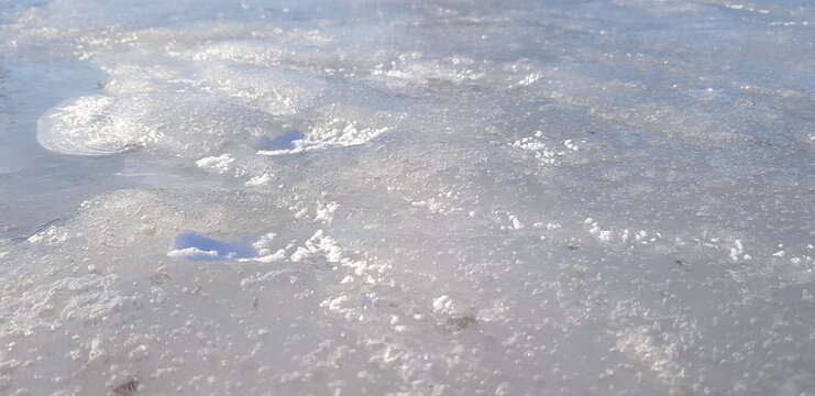 Macro sparkling snow crystals covering frozen ground with bokeh frost texture and shimmer