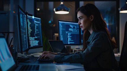 A female junior software engineer writes code on a desktop computer with two monitors and a laptop in a stylish office. A Caucasian woman working on an artificial intelligence service for a big tech