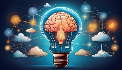 brain inside lightbulb connecting to cloud icons symbolizing idea generation