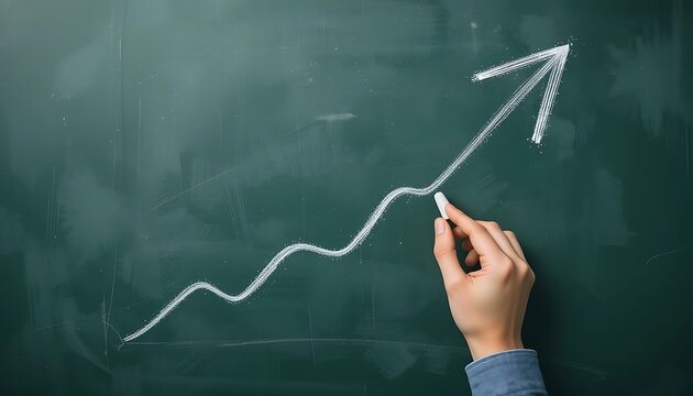 Drawing Upward Trending Arrow with Chalk on Green Blackboard Success Concept