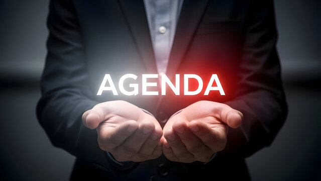 Person in suit holding hands open with glowing AGENDA text agenda meeting