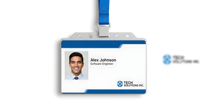 Mockup of a corporate employee identification card with a photo and blue lanyard, displayed on a clean white background