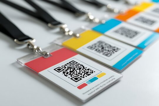 Row of Identification Badges with Colorful Headers and Lanyards on White Surface