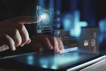 Cyber security and verification identity concepts. Businessman scans his thumb, biometric fingerprint scanning on futuristic hologram virtual screen while using laptop computer to access code.