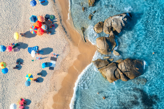 Aerial view of colorful umbrellas, sandy beach and blue sea with waves and rocks at sunset. Summer in Sardinia island, Italy, Tropical seascape. Top drone view of clear water, relaxing people, beach