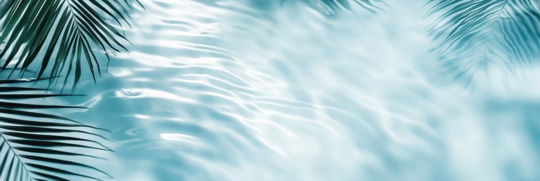A serene and picturesque tropical scene that beautifully captures the essence of summer, featuring calm, crystalclear waters, and lush, vibrant palm fronds swaying gently in the warm breeze