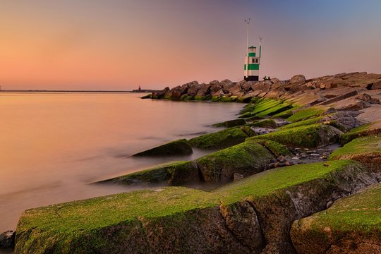 Harbour entrance with breakwave and lighthouse and oil refineries in background in Ilmuiden, Amsterdam, Netherlands