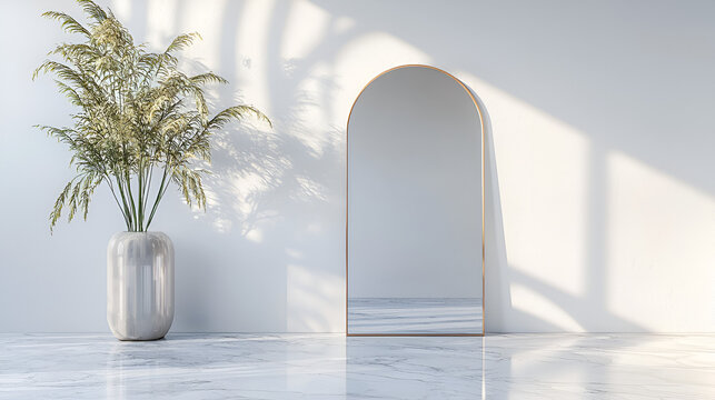 Modern interior featuring an arched mirror and a vase with ornamental grass, bathed in soft sunlight creating shadows.