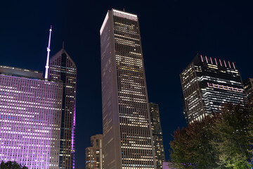 Cityscape night with skyscraper building. Skyline architecture. Chicago city illuminated building. Night in Chicago city downtown. Skyscraper architecture. Chicago city cityscape. Bustling nightlife